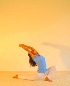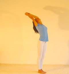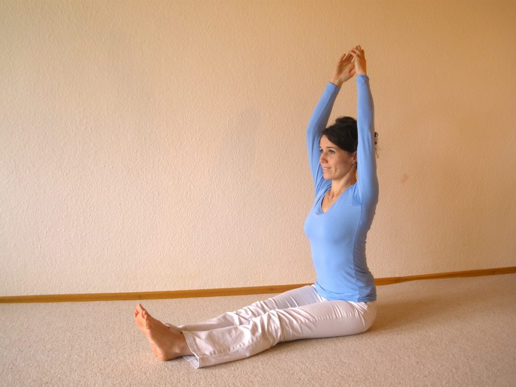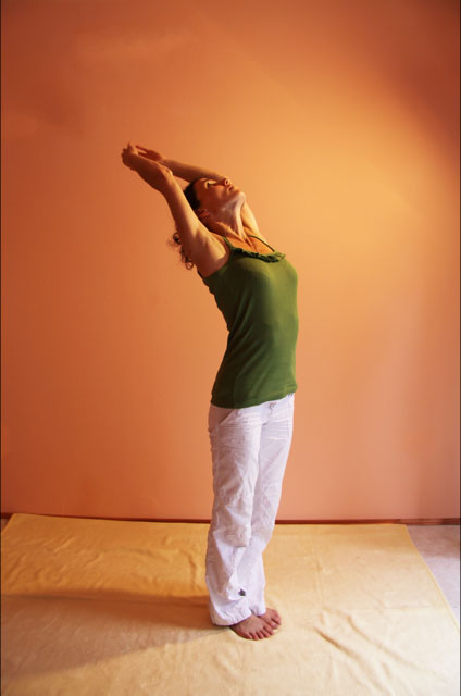 Damit der Oberkörper in der Spannung doch leicht und gelöst bleibt und die Öffnung im Oberkörper erlebt werden kann, ist es wesentlich eine Spannkraft in der unteren Brustwirbelsäule gezielt aufzubauen. Auf dieser Art entsteht dort eine Zentrierung. Sie bildet die Grundlage für das dynamische Herauswachsen in die Rückwärtsbeuge. Der untere Rücken und das Becken bleiben stabil. Diese leichtere Ausführung – wie auf dem Bild – kann im Alltag nach langem Sitzen hervorragend für ein paar Male leicht und dynamisch ausgeführt werden. Die eigene Aufrichtekarft wird neu impulsiert. Durch eine bewusst hineingelegte Gliederung der Bewegung kann die Stellung sogar zu einer intensiven Rückwärtsbeuge weiter ausgeführt werden. Die Wirbelsäule wird in jedem Falle stabilisiert, entlastet und gekräftigt.