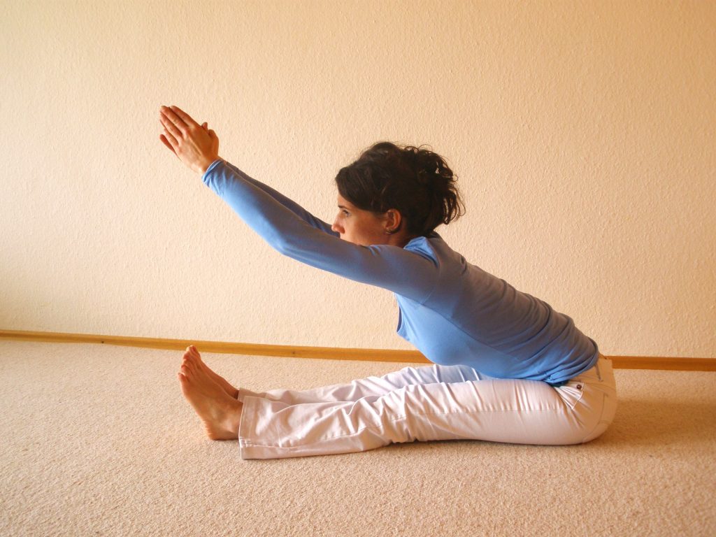 Diese Vorwärtsbeuge geschieht durch ein zentriertes und aktives Wachsen in die Länge aus der Mitte der Wirbelsäule. Der Oberkörper dehnt sich weit nach vorne aus und zeigt eine überaus arbeitsintensive und grenzüberschreitende Stellung!