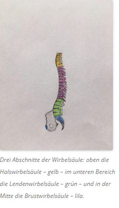 Drei Abschnitte der Wirbelsäule: oben die Halswirbelsäule – gelb – im unteren Bereich die Lendenwirbelsäule – grün – und in der Mitte die Brustwirbelsäule – lila.
